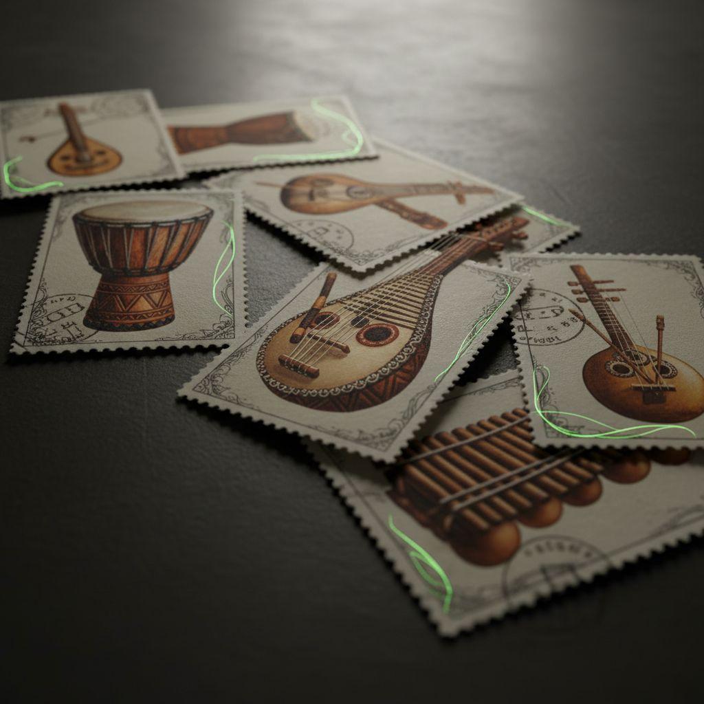Um guia prático e cultural sobre selos que ilustram instrumentos musicais africanos, para pesquisadores, colecionadores e professores interessados em etnomusicologia.